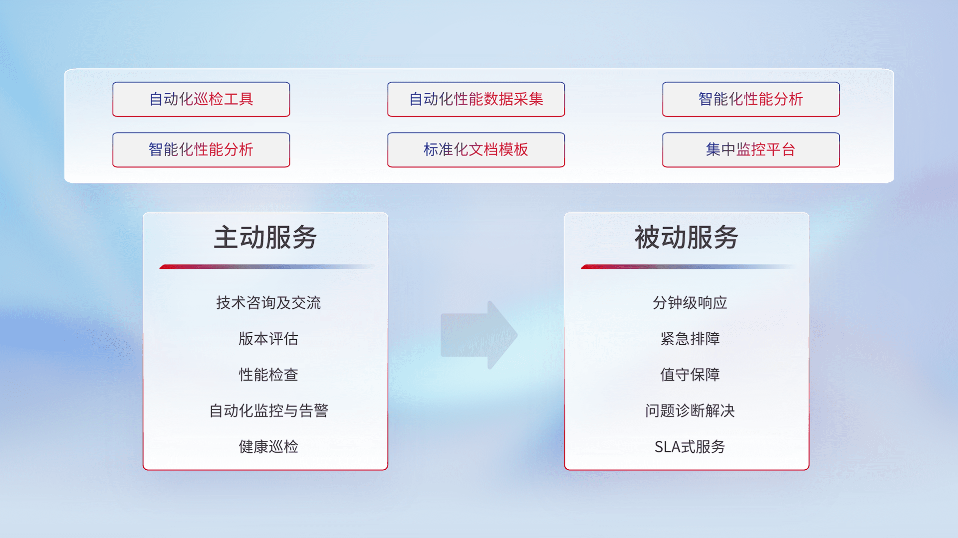 智能化工具和标准化文档,,保障服务质量,,,提供主动服务(包含技术咨询、、版本评估、、、性能检查、、、自动化监控与告警、、、健康巡检)和被动服务包含(分钟级响应、、、、紧急排障、、值守保障、、、、问题诊断解决、、SLA服务)。。
